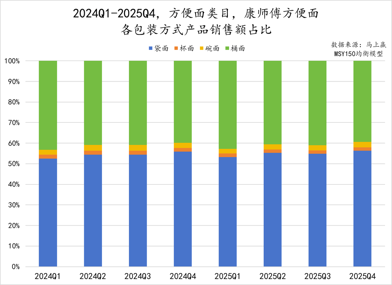 从包装神气的变化上看,天然袋面、桶面二者依旧是家内、家外场景中最常剿袭的包装类型。但跟着用餐场景的拓展,杯面、碗面等适应不同忽地东说念主群、忽地俗例的家具也占据了一定例模,且在2024年至2025年呈上升趋势。