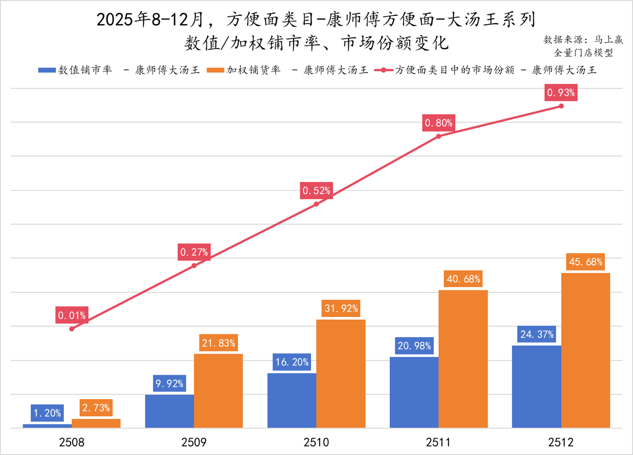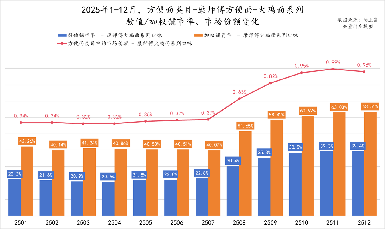 2025年7月起,康师父火鸡面系列的数值铺市率和加权铺市率双双运行显著上升,尔后果真每个月王人在“上台阶”。铺货率的变化响应在市集份额上,下半年两者数值增长节律高度吻合。