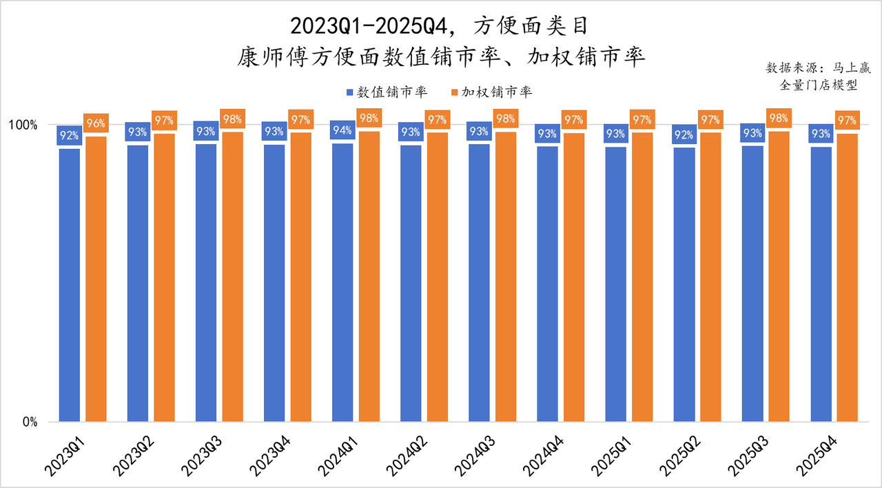 线下零卖的迫切方针中,数值铺市率响应的是渠说念遮掩的“广度”即有几许家店在卖康师父便捷面——2023年至2025年,康师父铺市率历久安谧在92%以上。“有便捷面就有康师父”,在数据眼前似乎成了事实。