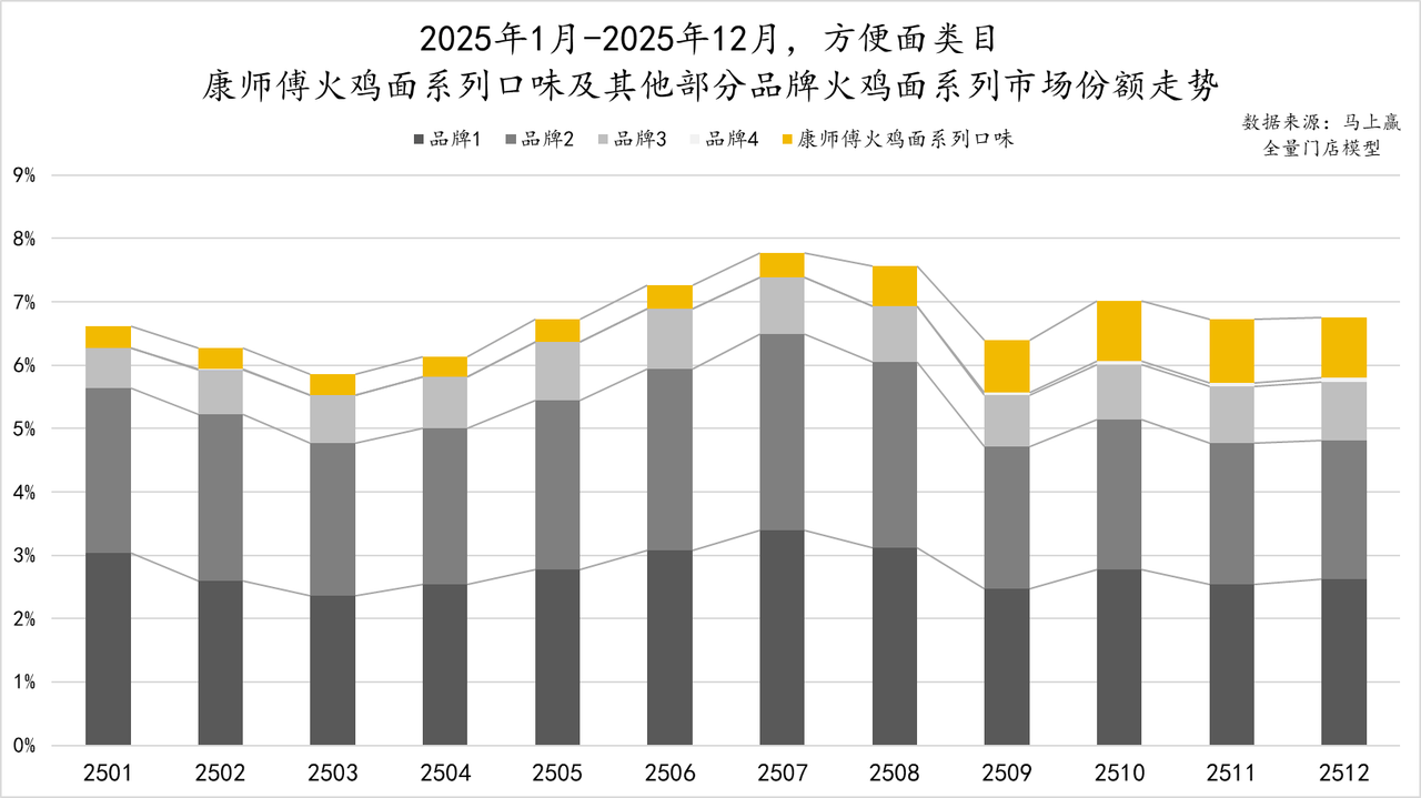 自2025年7月、8月起,康师父火鸡面系列市集份额出现显著跃升,并在尔后保合手了增长态势与份额,对其他品牌的火鸡面系列家具酿成了显著的挤压。以2025年12月,康师父的火鸡面系列市集份额对连年头,系列市集份额翻了一倍过剩。