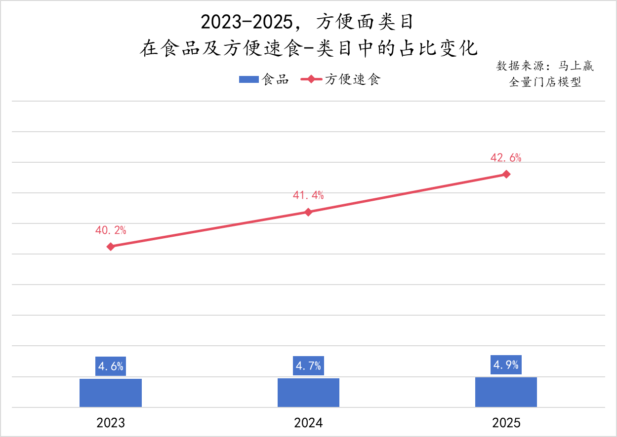 立时赢数据显露,2023年至2025年,传统线下零卖渠说念中,便捷面类目在食物大类中的销售额占比近5%,在便捷速食类目中占比则跨越40%,实打实的数据标明:便捷面不仅没被外卖干掉,反而在零卖渠说念中的迫切性还在进一步提高。